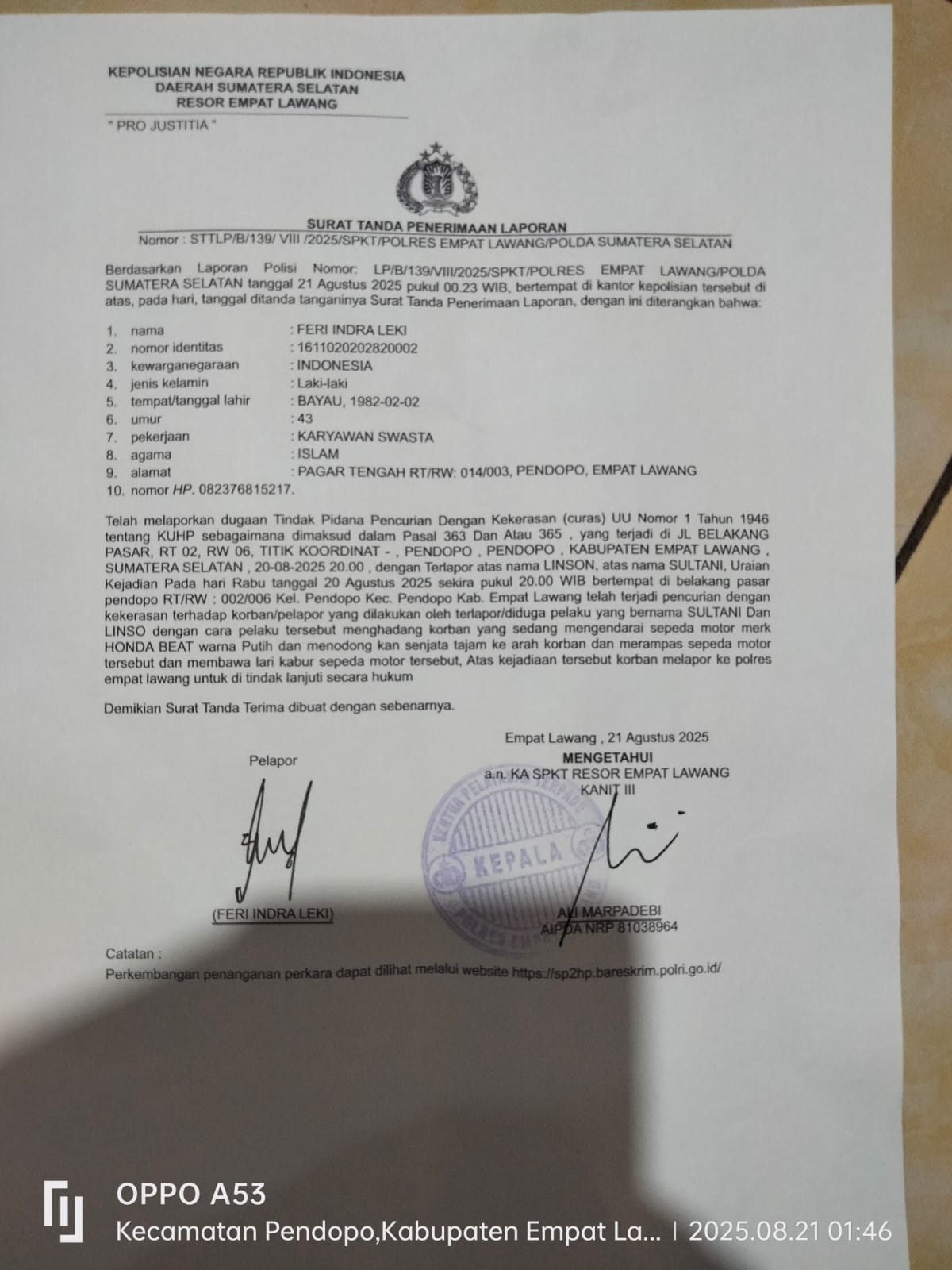 Laporan nomor STTLP/B/139/VIII/2025SPKT/POLRES EMPAT LAWANG /POLDA Sumatera Selatan